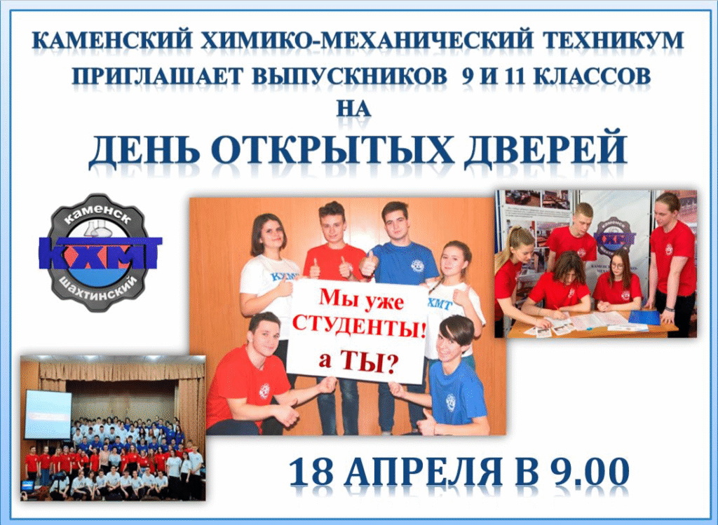 Государственное бюджетное профессиональное образовательное учреждение Ростовской области «Каменский химико-механический техникум» приглашает всех желающих на день открытых дверей, который состоится 18 апреля 2026 года в 09:00